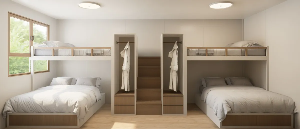 静かで心地よい空間に設置されたカプセルベッドとダブルベッドが、心と身体を優しく解きほぐし、深い休息を提供します。